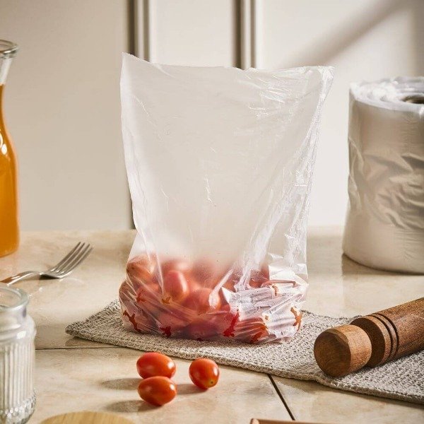 Bobina de bolsas de polietileno de alta densidad transparentes, con corte troquelado para arrancar de a una.