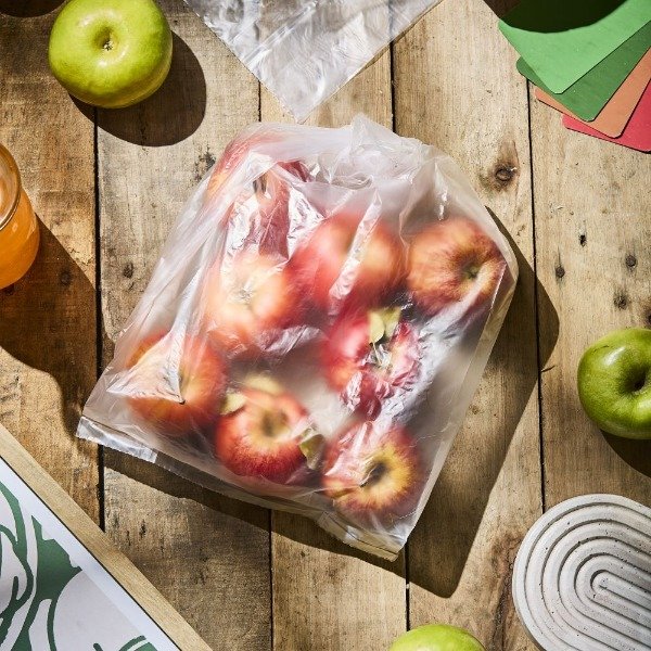 Bobina de bolsas de polietileno de alta densidad transparentes, con corte troquelado para arrancar de a una.